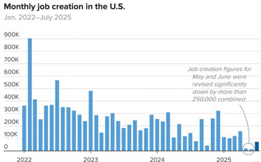 Pastaraisiais mėnesiais naujų darbo vietų kūrimas JAV reikšmingai sulėtėjo — gegužės ir birželio skaičiai buvo pakoreguoti žemyn daugiau nei ketvirčiu milijono, o liepą sukurtų darbo vietų skaičius buvo vienas mažiausių per pastaruosius metus. Tuo pat metu nedarbo lygis pakilo iki aukščiausio taško per ketverius metus. Tai rodo, kad darbo rinka silpsta, o tarifų poveikis kol kas neskatina gamybos sektoriaus atsigavimo ar žadėto darbo vietų bumo.