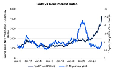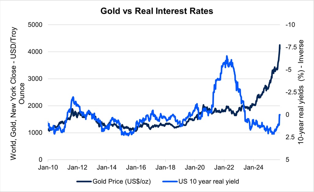Auksas istoriškai yra jautrus realių palūkanų normų pokyčiams ir JAV dolerio stiprumui. Kai realios obligacijų grąžos didėja, obligacijos tampa patrauklesne alternatyva, nes generuoja realią grąžą, tuo tarpu auksas pajamingumo negeneruoja.