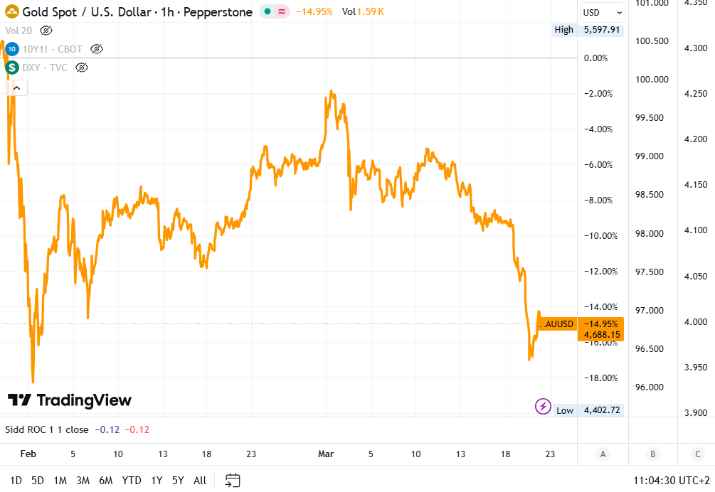 Kovo mėnesį būtent šis argumentas sustiprėjo. Didesni pajamingumai reiškė, kad dalis kapitalo vėl pradėjo žiūrėti į obligacijas ne kaip į nuobodžią alternatyvą, o kaip į visai logišką vietą kapitalui perkelti. Tokiais momentais auksas dažnai praranda dalį savo trumpalaikio patrauklumo.