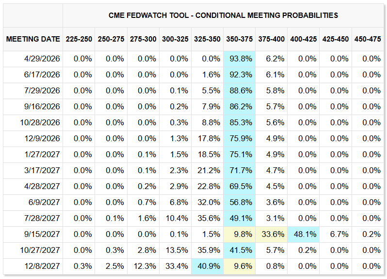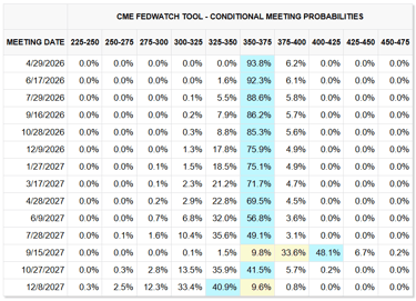 Apačioje pateiktame grafike matomos pakoreguotos rinkos tikimybės dėl FED palūkanų normų pokyčių artimiausiu laikotarpiu. Aiškiai matyti, kad rinka jau nebesitiki palūkanų mažinimo šiais metais, o priešingai – lūkesčiai pasislinko link ilgiau išliekančių aukštų palūkanų. Dar svarbiau, kad nuo 2027 metų rudens pradeda atsirasti ir palūkanų didinimo tikimybė, kas rodo iš esmės pasikeitusį rinkos požiūrį į būsimą pinigų politikos kryptį.