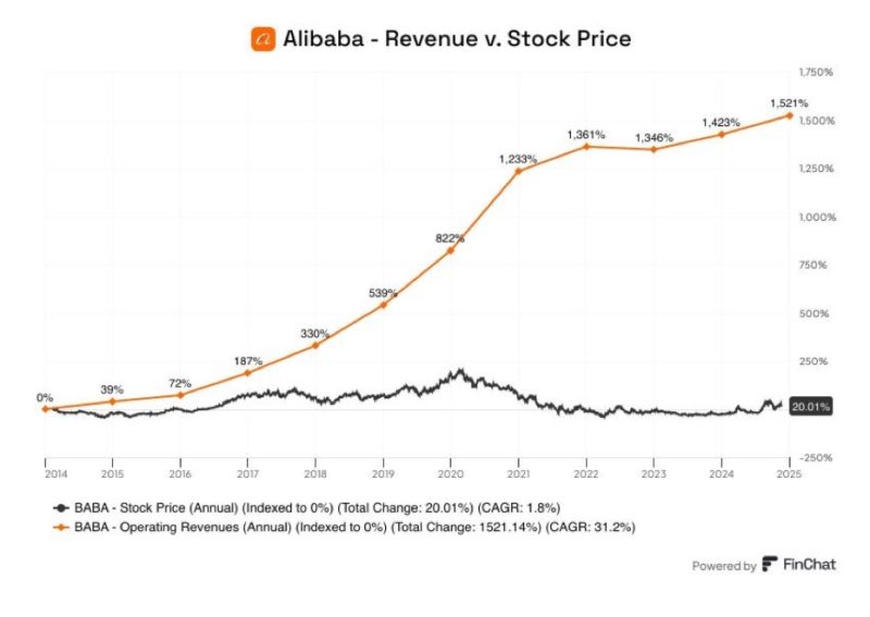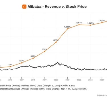 Per dešimtmetį įmonės pajamos išaugo +1521 %, o akcijų kaina – vos +20 %. Kodėl? Nes kartais neužtenka gerų veiklos rezultatų – kai investuotojai vengia regiono dėl geopolitikos, reguliacijos ar pasitikėjimo stokos, tai jau kita istorija.