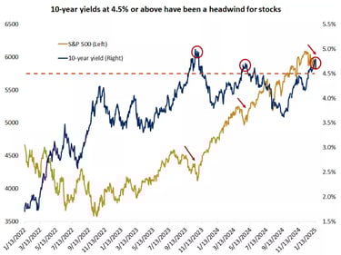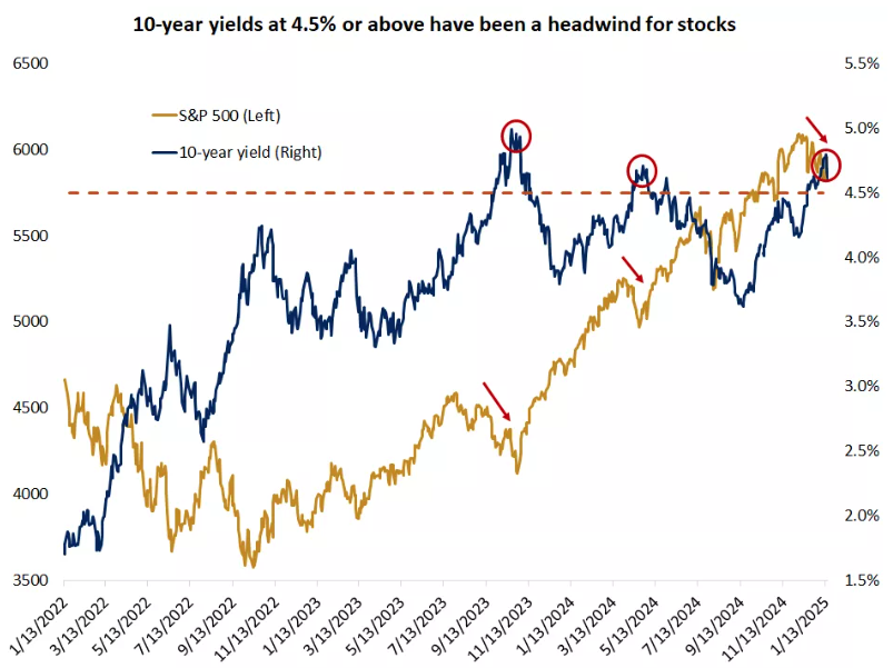 Per pastaruosius metus 10-ies metų JAV obligacijų pajamingumo augimas virš 4,5% dažnai sutapo su reikšmingomis akcijų kainų korekcijomis. Aukšti pajamingumai daro spaudimą akcijų rinkoms, nes didina skolinimosi kaštus, mažina investuotojų norą prisiimti riziką ir skatina svarstyti, ar verta tęsti investicijas į santykinai rizikingesnes akcijas, ar pereiti prie saugesnių obligacijų. Šie poveikiai buvo matomi ankstesniuose rinkos nuosmukiuose. Tačiau naujausi infliacijos duomenys paskatino pajamingumų mažėjimą, suteikdami rinkoms optimizmo dėl palankesnių sąlygų bent artimiausiu laikotarpiu.