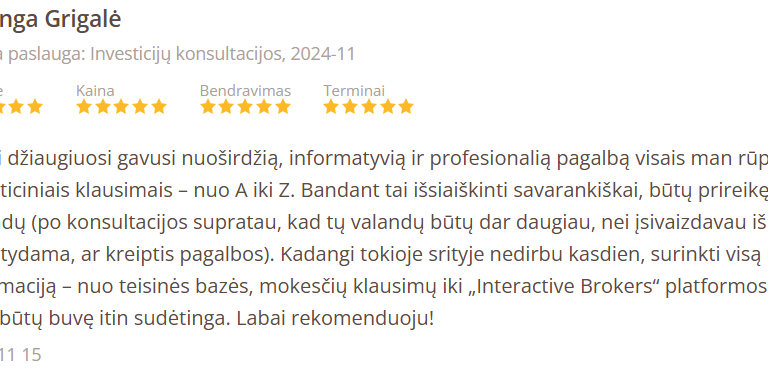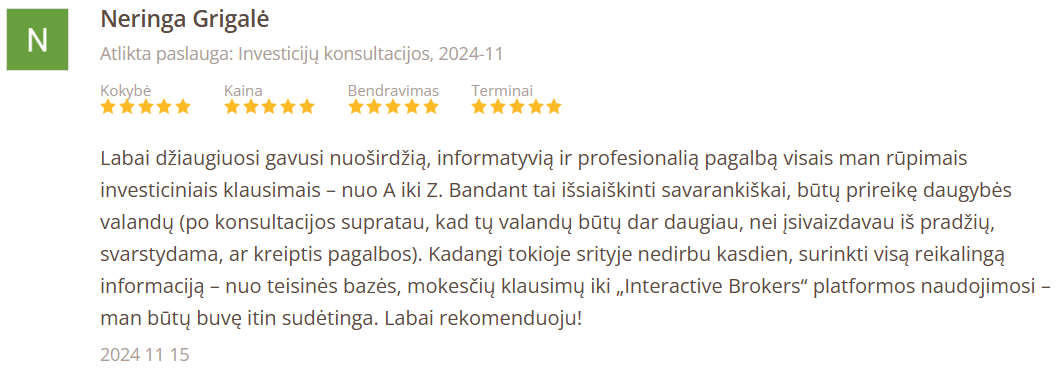 Pastaba: konsultacija yra edukacinio pobūdžio ir jos metu nėra teikiamos investavimo rekomendacijos, kaip jos suprantamos pagal LR Finansinių priemonių rinkų įstatymą.