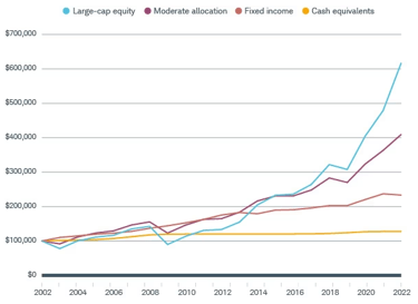 Investavus 100000 USD į JAV akcijas dar 2002 m., po 20 metų būtumėte galėjęs džiaugtis didesniu nei pusės milijono pelnu. Tuo tarpu investavus į konservatyvesnes turto klases, kaip obligacijas ar pinigų rinkos priemones, grąžą būtų kur kas žemesnė. Visgi, svarbu atkreipti dėmesį, kad portfelis sudėliotas iš skirdingų turto klasių, atitinkamą laiko tarpą, būtų sugeneravęs net didesnę gražą nei investavus tik į akcijas. Taip pat, būtų susiduręs su mažesneis rinkos vertės svyravimais.
