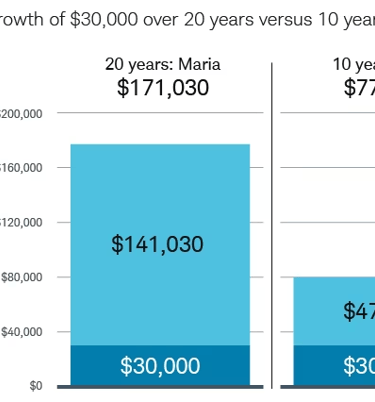 Marija ir Ana kiekvienais metais sausio 1 d. investuodavo po 3000 USD, nepaisant to, ar rinka kilo, ar smuko. Marija pradėjo investuoti prieš 20 metų, o Ana pradėjo prieš 10 metų, tačiau dvigubai didesne suma, t.y. po 6000 USD. Nors abi investavo iš viso po 30000 USD per savo investavimo laikotarpį, laikotarpio gale Marijos rezultatas buvo apie 93000 USD didesnis vien dėl to, kad jos investavimo laikotarpis buvo ilgesnis. Finansų rinkose daugiau įtakos turi laikas nei investuojama suma.