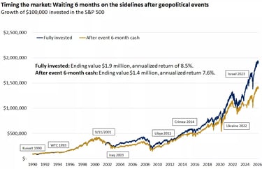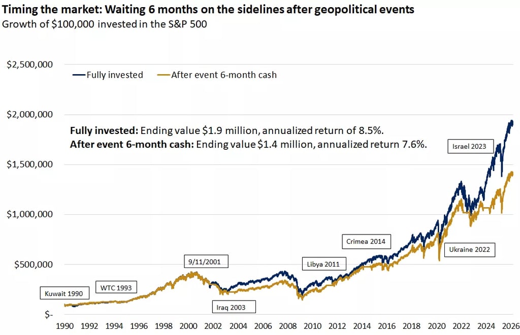 Tačiau jei po kiekvieno didesnio geopolitinio įvykio jis būtų nusprendęs pasitraukti iš rinkos ir palaukti 6 mėnesius, kol viskas nurims, galutinis rezultatas būtų sumažėjęs iki maždaug 1,4 mln. Vidutinė metinė grąža tokiu atveju siektų apie 7,6%.