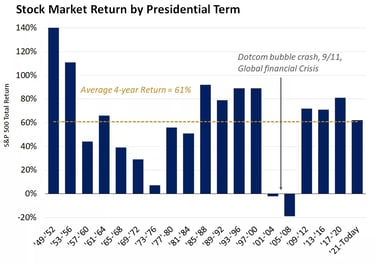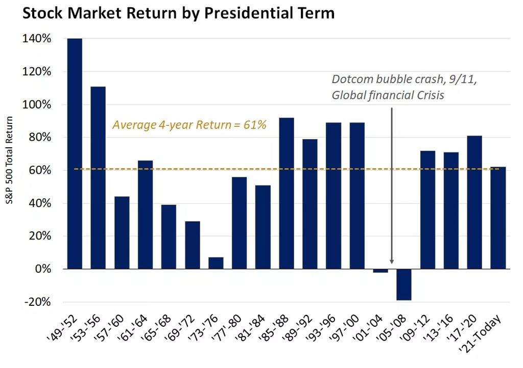 📖 Istorija rodo, kad rinkos po prezidento rinkimų dažnai susiduria su trumpalaikiu volatilumu, tačiau ilgesnėje perspektyvoje akcijų rinkos dažniausiai atsigauna. Tai reiškia, kad svarbiausia yra laikytis ilgalaikės investavimo strategijos, remiantis ekonominiais veiksniais, o ne tiesiog politiškai motyvuotais sprendimais. Akcijų rinka turi tendenciją augti, nepriklausomai nuo to, kuri partija laimi rinkimus. Vidutinė ketverių metų akcijų rinkos grąža yra 61%, o reikšmingiausi kritimai buvo susiję su globalinėmis krizėmis, pvz., 2008 m. finansų krize ar „dotcom“ burbulo sprogimu 2000-aisiais. Tai reiškia, kad ekonominiai ir rinkos veiksniai, o ne politinės partijos, dažniausiai lemia ilgalaikį akcijų rinkos augimą.