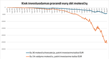 🎯 Išvada: jei investuoji ilgam laikotarpiui, maži, bet pastovūs mokesčiai kaupiasi. Ir kaupiasi rimtai!