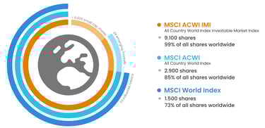Nors yra galimybė investuoti į kiekvieną atskirą ETF, kuris sektų vieną iš keturių indeksų, tačiau investuodami į MSCI ACWI IMI investuotumėte į visus keturis vienu metu. Tai ultra plačiai diversifikuotas indeksas, kuris yra sudarytas iš 9022 akcijų ir sudaro 99% viso pasaulio 🌍 😱 akcijų investuojamos rinkos kapitalizacijos.