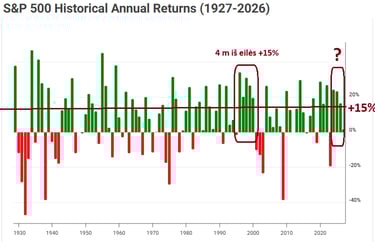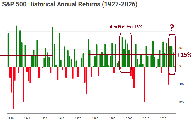 Nuo 1927 m. S&P 500 indeksas tik vieną kartą istorijoje yra užfiksavęs ketverius metus iš eilės, kai metinė grąža viršijo +15%. Tai įvyko 1995–1999 m. laikotarpiu.
