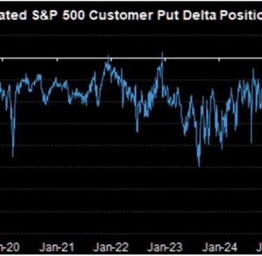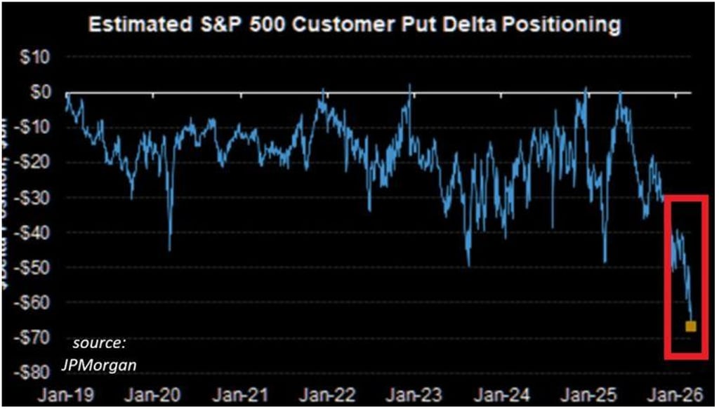 Grafike matomas S&P 500 investuotojų put opcionų pozicionavimas, kuris parodo, kiek rinkos dalyviai yra apsidraudę nuo akcijų kritimo. Kuo labiau neigiama šio rodiklio reikšmė, tuo daugiau investuotojai yra nusipirkę apsidraudimo nuo rinkos kritimo.