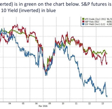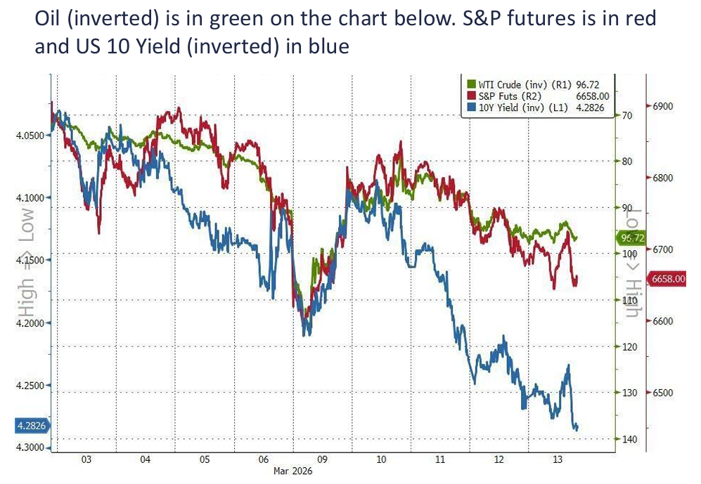 Viršuje esantis grafikas labai aiškiai parodo ryšį tarp trijų rinkų – naftos kainos, JAV akcijų ir JAV obligacijų pajamingumo. Istoriškai energijos kainų šuoliai dažnai sutampa su didesniu nepastovumu akcijų rinkose ir aukštesniais obligacijų pajamingumais. Investuotojams tai svarbu todėl, kad energijos kainos gali tapti vienu iš pagrindinių veiksnių, kuris keičia visos rinkos kryptį.